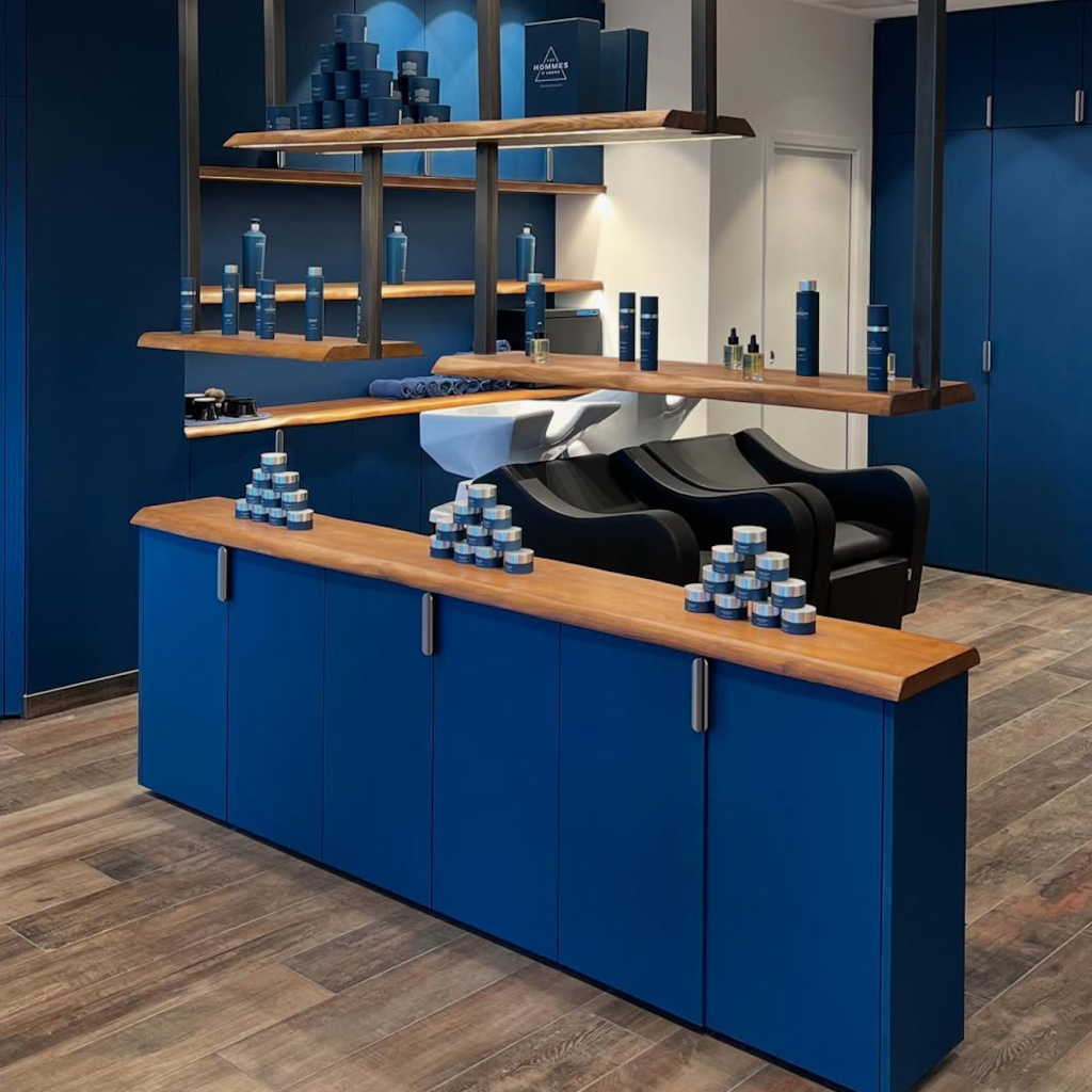 - Salon de coiffure : Aménagement d’un espace moderne et accueillant, avec des rangements astucieux et des finitions haut de gamme, alliant praticité et design pour une expérience client optimale.