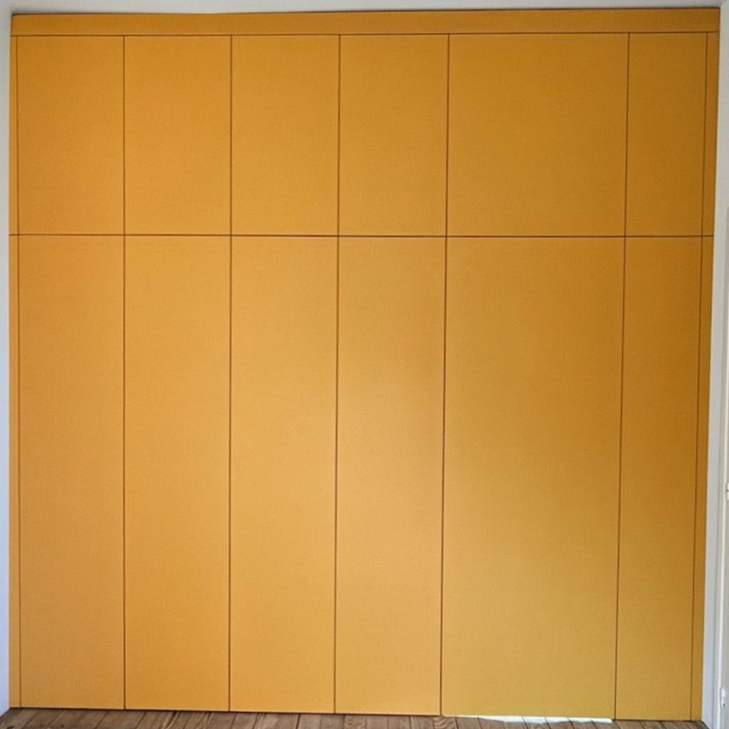 Les façades extérieures sont réalisées en médium (MDF) à peindre, un matériau lisse et sobre, idéal pour des finitions mates et contemporaines. Il permet une grande liberté dans le choix des teintes — ici, des tons élégants et apaisants, allant du gris clair au jaune ocre — selon l’ambiance souhaitée par les clients.