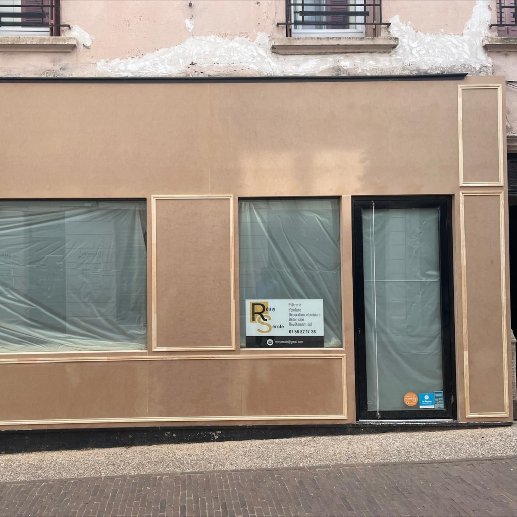 Côté rue, nous avons conçu et fabriqué une nouvelle façade en médite extérieur, soigneusement moulurée et habillée de tasseaux et moulures en sapin. L’ensemble vient se superposer à l’ancienne structure noire, conservée en partie pour servir de base solide et assurer la continuité visuelle du bâtiment. Le choix du vert sauge pour la finition apporte une touche naturelle, douce et contemporaine, tout en s’accordant harmonieusement avec les teintes urbaines du centre-ville de Roanne. Les séparations en chevrons de sapin rythment la façade et soulignent les ouvertures, conférant au magasin un aspect à la fois chaleureux et raffiné.
