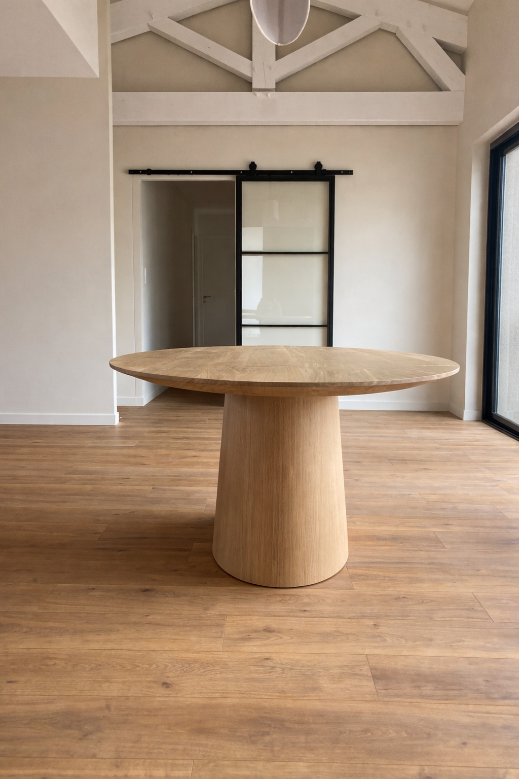 Le piètement tronqué, signature de cette table, lui confère une identité unique. Réalisé en placage chêne avec une finition vernis mat, il mesure 70 cm de hauteur et assure à la fois stabilité et esthétisme. Sa forme conique inversée structure l’ensemble tout en libérant l’espace pour les assises, offrant un confort optimal autour de la table.