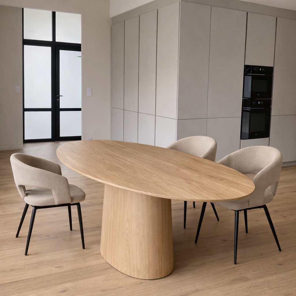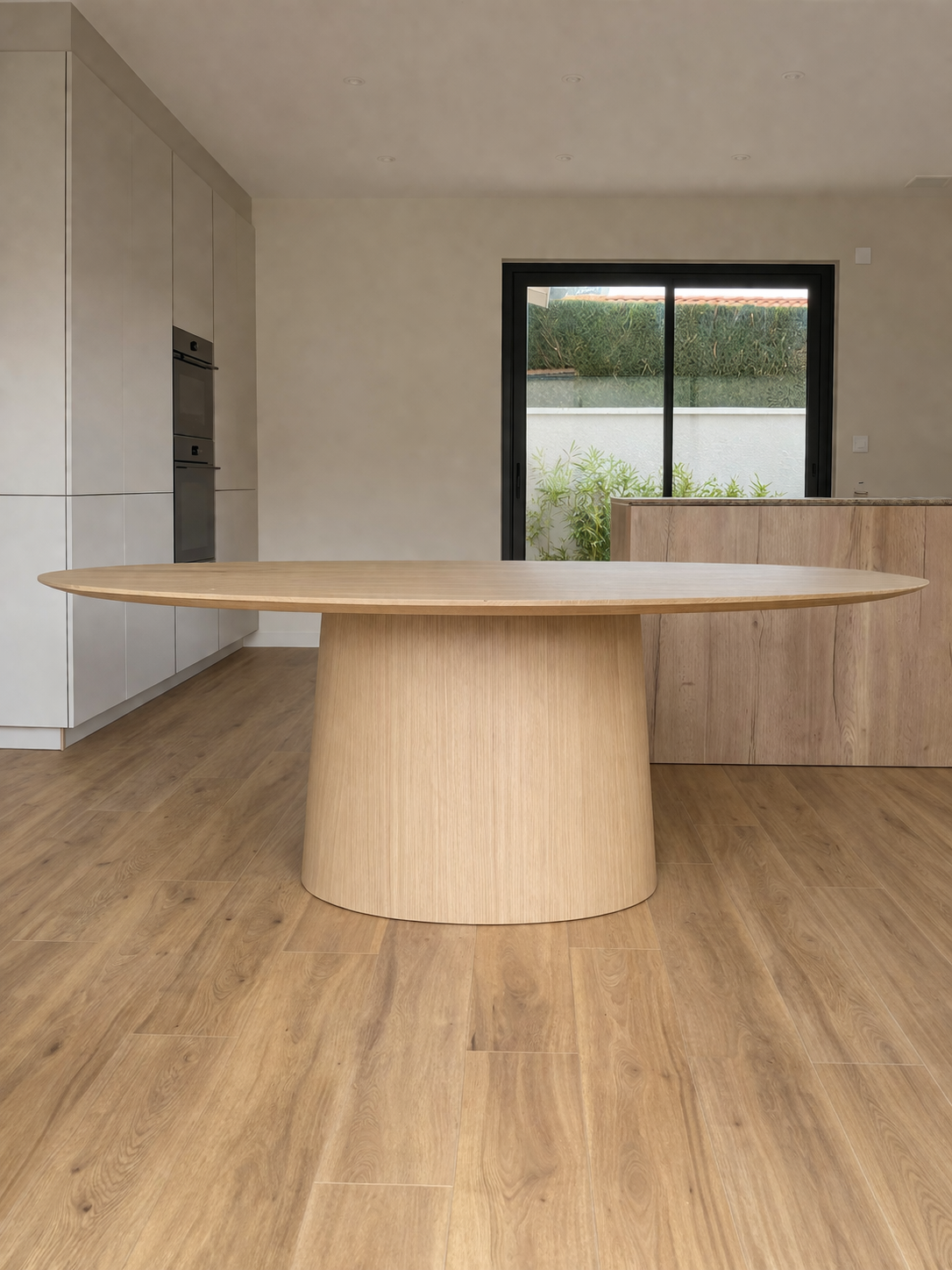 Son plateau ovale en chêne massif, aux dimensions généreuses de 220 x 110 cm, offre un espace convivial idéal pour accueillir 6 à 8 personnes. Avec une épaisseur de 5 cm, il affirme une présence forte et élégante, tout en mettant en valeur la noblesse du bois. Les bords biseautés intérieurs apportent une finesse visuelle supplémentaire, allégeant le plateau et créant un jeu subtil entre robustesse et légèreté.